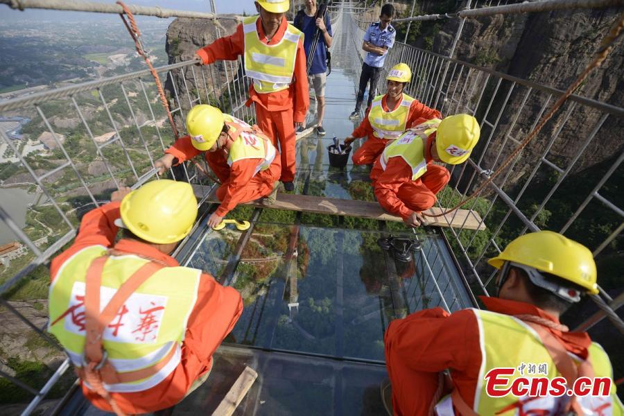 Chinese workers replace a scratched piece of glass with a new one on the glass-bottomed suspension bridge 180 meters above the ground at the Shiniuzhai National Geopark in Pingjiang county, Yueyang city, Central China's Hunan province, September 19, 2016.(Photo: China News Service/Yang Huafeng)
