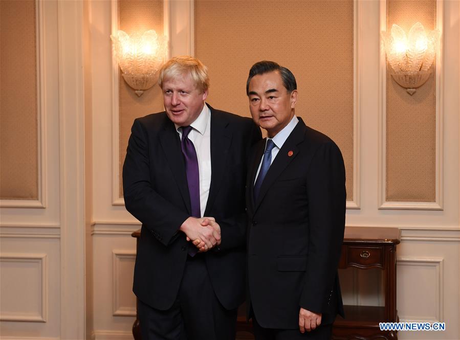 Chinese Foreign Minister Wang Yi (R) meets with British Foreign Secretary Boris Johnson in New York, the United States, Sept. 19, 2012. (Xinhua/Yin Bogu)