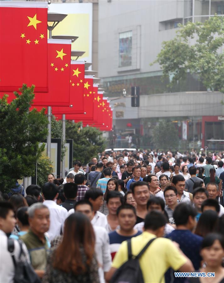 Tourists walk on the Nanjing Road in east China's Shanghai, Oct. 1, 2016. People enjoy their first day of the week-long National Day holiday on Saturday. (Xinhua/Ding Ting)