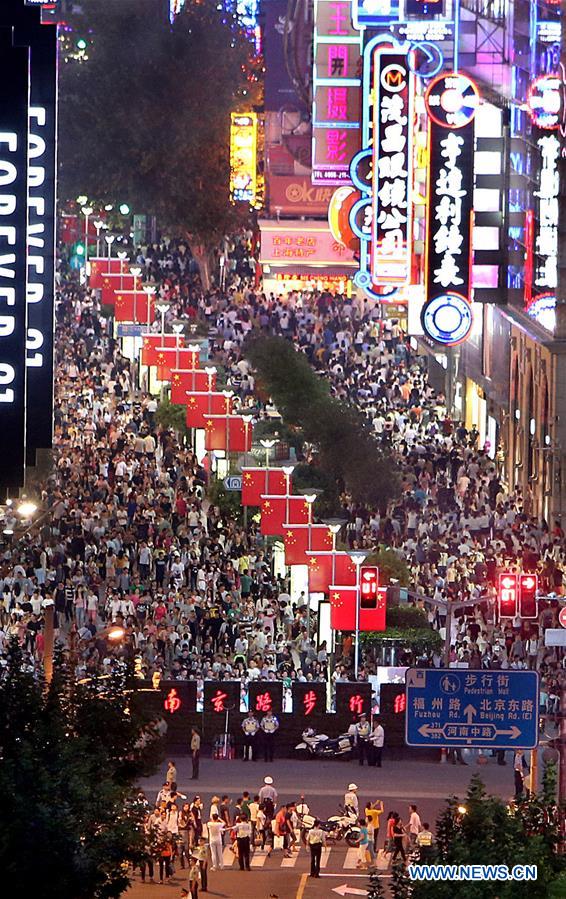 Tourists walk on the Nanjing Road in east China's Shanghai, Oct. 1, 2016. People enjoy their first day of the week-long National Day holiday on Saturday. (Xinhua/Fan Jun)
