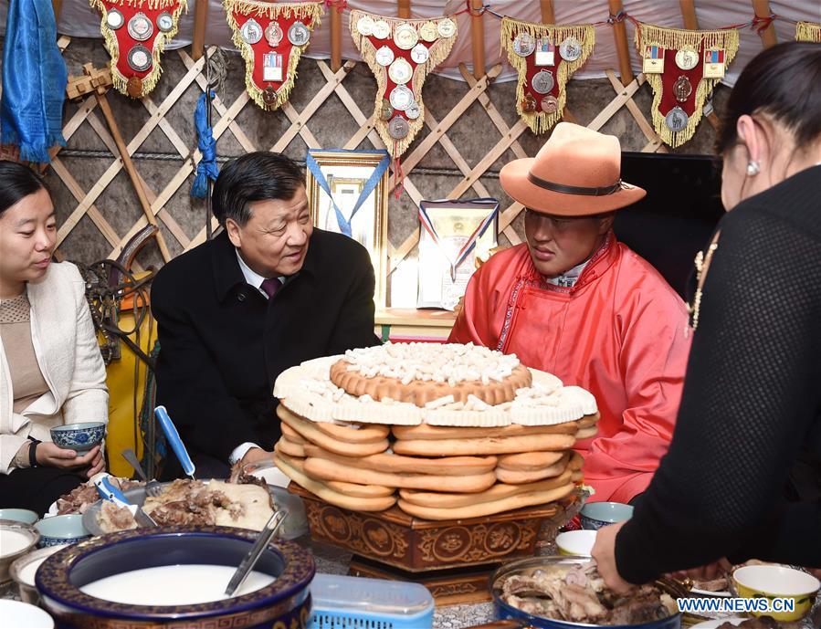 Liu Yunshan (2nd L), a member of the Standing Committee of the Political Bureau of the Central Committee of the Communist Party of China, visits the home of a herdsman in Central Aymak of Mongolia Oct. 2, 2016. (Xinhua/Rao Aimin)