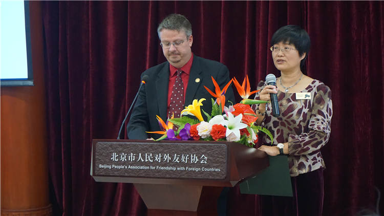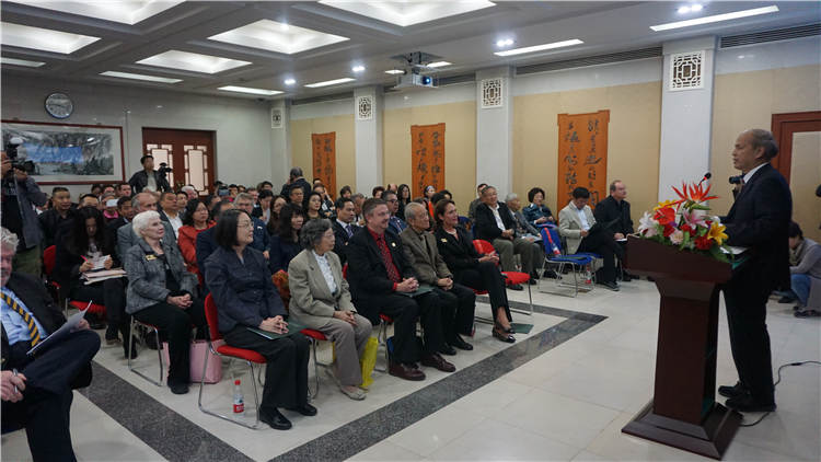 Scott Wagner, left, Mayor Pro Tem of Kansas, Edgar Snow's hometown, addresses the 17th Edgar Snow Symposium in Beijing on Oct. 11, 2016. [Photo/people.cn]