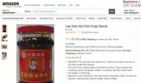 Laoganma chili sauce, a famous condiment in China, also gained an excellent reputation in the U.S. market. The well-priced sauce from China is viewed as a kind of luxury product halfway around world, where it is sold for $10 to $20. Some fans of the brand have even established dedicated pages for it on social media.