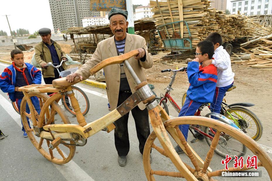 A woodworker for over 50 years, 67-year-old Mamatta Sadi from Avati County Xinjiang Uyghur Autonomous Region tested his purely hand-made wooden bicycle on the road attracting many onlookers. The bike is 2.8 meters long, 1.3 meters high, and except for a few metal pieces including more than 10 screws and bearding, the whole bicycle is made of wood. The bicycle took Sadi more than one month to complete, but he says it's not completely finished yet. He intends to add a bell, proper rubber tires and some iron pieces to strengthen the bicycle. [Photo: Chinanews.com]