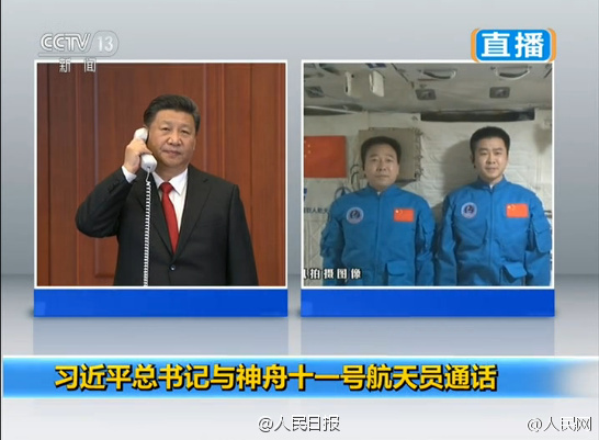 BEIJING, Nov. 9 (Xinhua) -- Chinese President Xi Jinping on Wednesday talked with the two astronauts in the space lab Tiangong-2, at the command center of China's manned space program in Beijing.