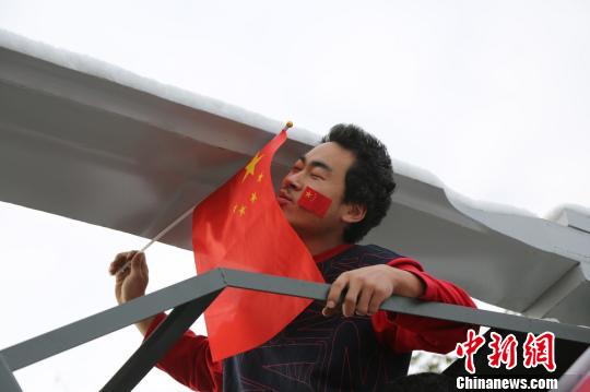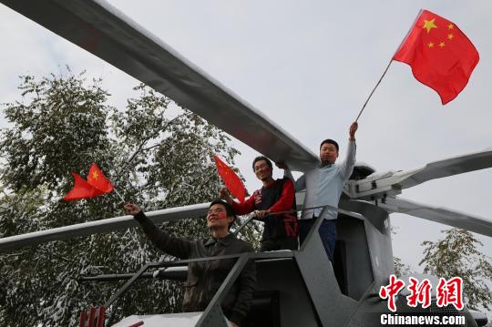A large helicopter model debuted in Hutubi County, Xinjiang on Nov. 9. Its three creators climbed on top of the model and waved the national flag to celebrate their success.