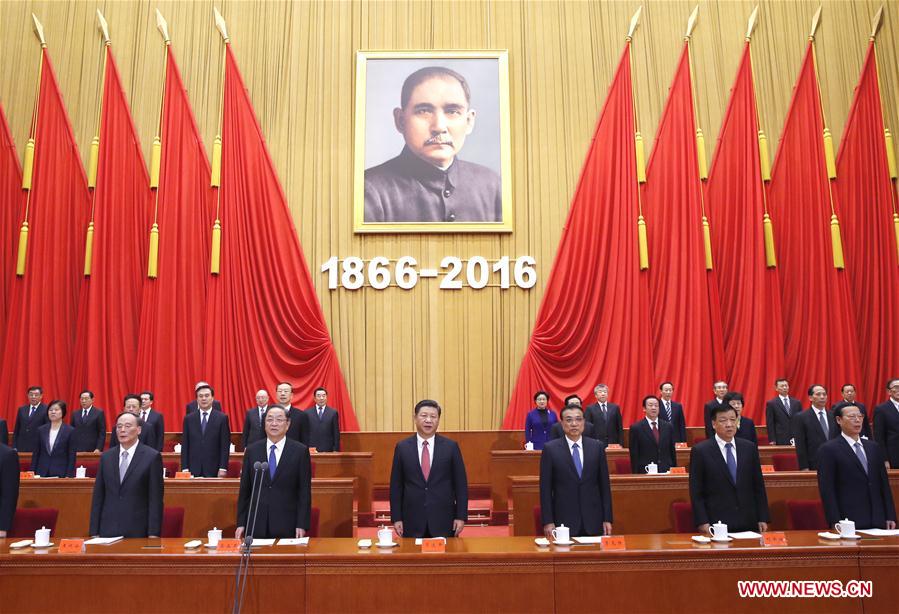 General Secretary of the Communist Party of China (CPC) Central Committee Xi Jinping (3rd L, front) and other senior leaders Li Keqiang (3rd R, front), Yu Zhengsheng (2nd L, front), Liu Yunshan (2nd R, front), Wang Qishan (1st L, front) and Zhang Gaoli (1st R, front) attend a gathering to commemorate the 150th anniversary of Sun Yat-sen's birth in Beijing, capital of China, Nov. 11, 2016. (Xinhua/Ju Peng)