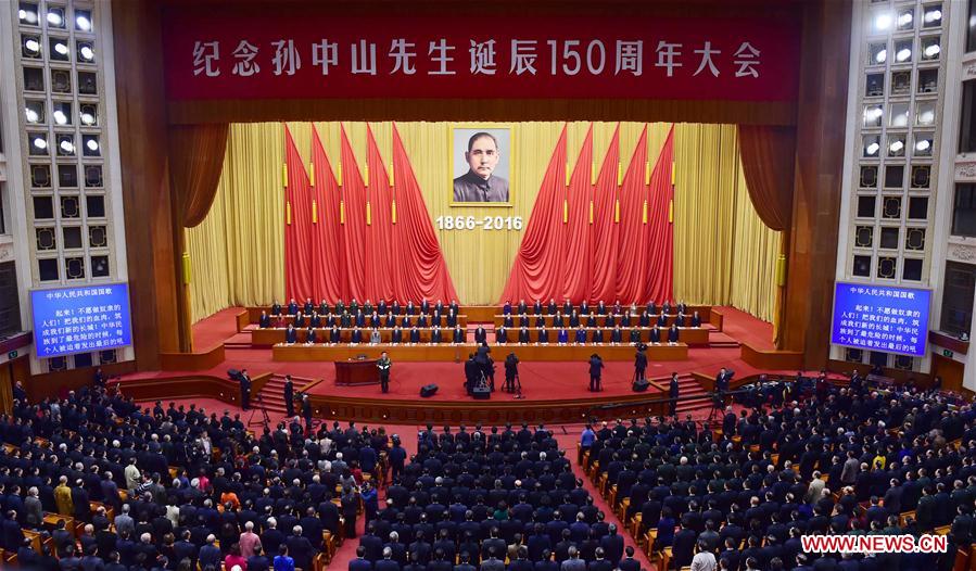 A gathering to commemorate the 150th anniversary of Sun Yat-sen's birth is held at the Great Hall of the People in Beijing, capital of China, Nov. 11, 2016. (Xinhua/Zhang Duo)