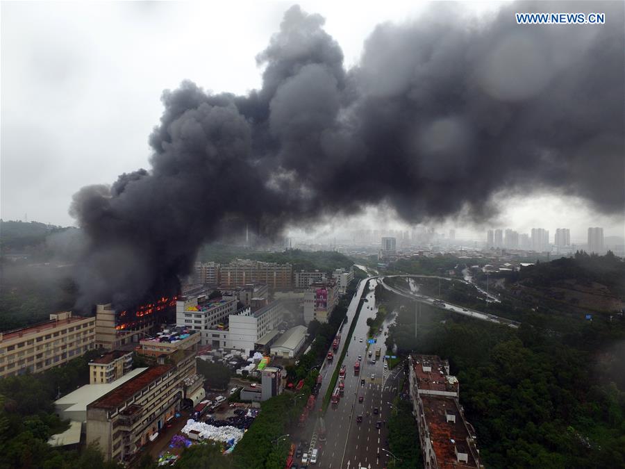 Photo taken on Nov. 26, 2016 shows the factory that caught fire in Quanzhou, southeast China's Fujian Province. A factory in Quanzhou caught fire on Saturday noon, and no casualty has been reported. (Xinhua)