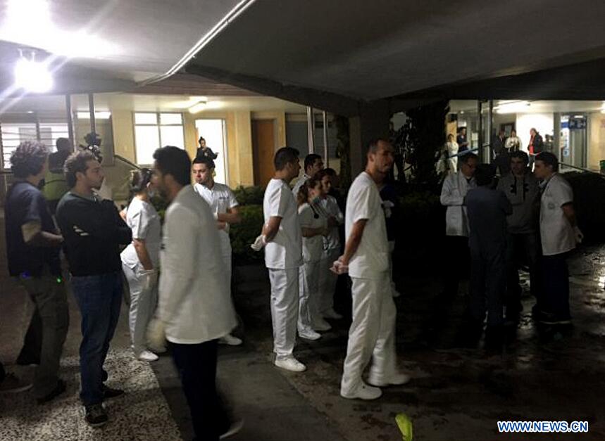 Photo taken on Nov. 29, 2016 provided by Noticias Telemedellin shows medical staffs waiting for survivors of the crashed plane carrying the Brazilian football team Chapecoense, at San Juan de Dios La Ceja Hospital, in La Ceja municipality, near Medellin, in the department of Antioquia, Colombia. An airplane with 72 people on board, including players from a Brazilian football team, has crashed in Colombia, the country's aviation authorities said. (Xinhua/Noticias Telemedellin)
