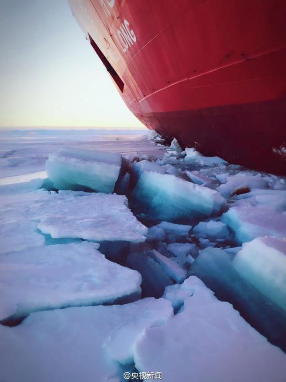 China's icebreaker Xuelong (Snow Dragon) arrives in Antarctica on December 5, 2016 after a one-month trip. The Chinese research vessel and icebreaker, which is on its 33rd Antarctic expedition, has made a stop at an ice zone nearly 31 kilometers away from Zhongshan Station. The expedition team has sent helicopters to explore the way through the ice in order to find the safest approach to Zhongshan Station. [Photo: Weibo account of CCTV News/Yang Litian]