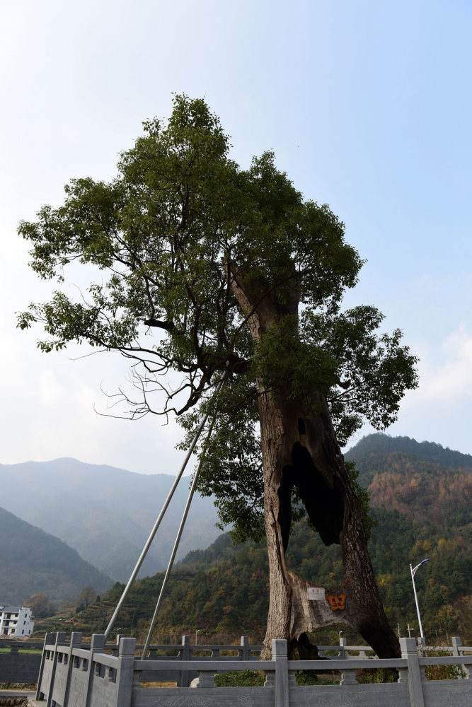 A 300-year-old tree in Wuyuan, Jiangxi province is still flourishing this cold December after being struck by lightning. There are only two strips of bark left on its trunk, which is 3 meters thick. The tree was trimmed from some 40 meters to just 10 after being hit. It has been listed as a major protected site by the local government.