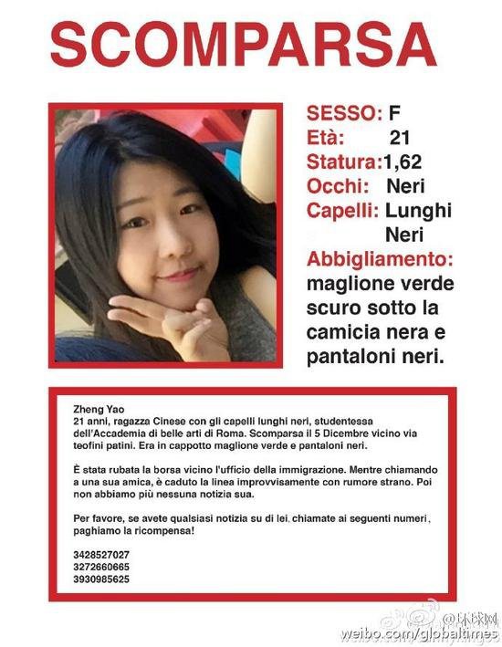 Zhang Yao, a 20-year-old female Chinese student at Rome University of Fine Arts, has been missing for more than 48 hours after getting robbed by a gang of refugees on Dec. 5. Local police in Rome have launched a search.
