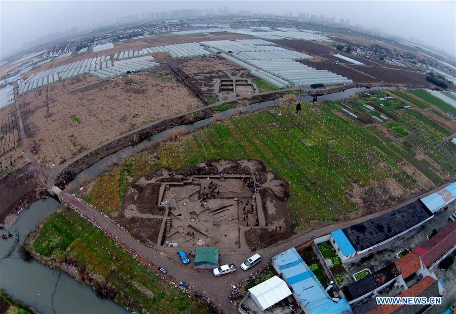 File photo taken on January 2016 shows the ancient Qinglong Township ruins in Shanghai, east China. Shanghai Museum on Thursday introduced the latest discovery since the excavation of the ruins in 2010. The Qinglong Township ruins is located in today's Baihe Township of Qingpu District in Shanghai, and documents recorded it as an important trade port in Tang (618-907) and Song (960-1279) Dynasties. In recent years, more than 6,000 restorable porcelain works and tens of thousands of broken porcelain pieces from nearby provinces were found in the ruins, which offers new evidence that Qinglong Township was an important port along the Maritime Silk Road. Besides, the discovery of the Longping temple, pagoda and its terrestrial palace in 2015 and 2016 helped the researchers to study the layout of the township as well as the history of China's ancient buildings and Buddhism. (Xinhua/Ren Long)