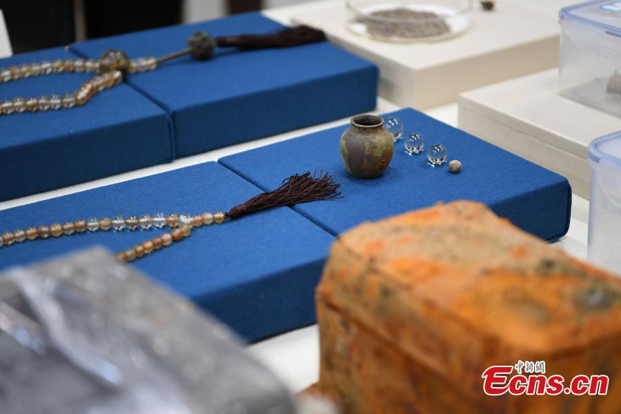 Relics unearthed from the ancient Qinglong Township ruins are seen in Shanghai, east China, Dec. 8, 2016. Shanghai Museum on Thursday introduced the latest discovery since the excavation of the ruins in 2010. The Qinglong Township ruins is located in today's Baihe Township of Qingpu District in Shanghai, and documents recorded it as an important trade port in Tang (618-907) and Song (960-1279) Dynasties. In recent years, more than 6,000 restorable porcelain works and tens of thousands of broken porcelain pieces from nearby provinces were found in the ruins, which offers new evidence that Qinglong Township was an important port along the Maritime Silk Road. Besides, the discovery of the Longping temple, pagoda and its terrestrial palace in 2015 and 2016 helped the researchers to study the layout of the township as well as the history of China's ancient buildings and Buddhism. (Photo: China News Service/Zhang Hengwei)