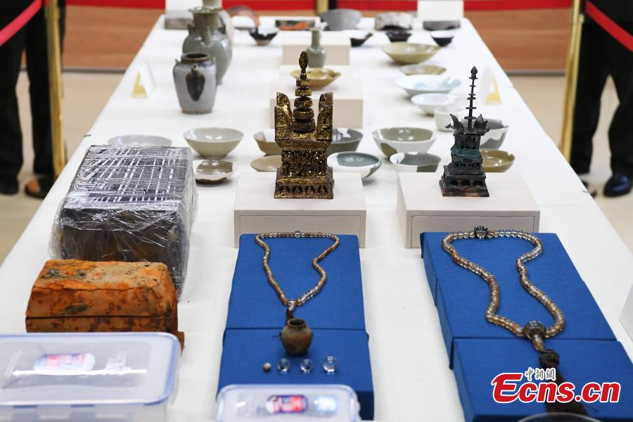 Relics unearthed from the ancient Qinglong Township ruins are seen in Shanghai, east China, Dec. 8, 2016. Shanghai Museum on Thursday introduced the latest discovery since the excavation of the ruins in 2010. The Qinglong Township ruins is located in today's Baihe Township of Qingpu District in Shanghai, and documents recorded it as an important trade port in Tang (618-907) and Song (960-1279) Dynasties. In recent years, more than 6,000 restorable porcelain works and tens of thousands of broken porcelain pieces from nearby provinces were found in the ruins, which offers new evidence that Qinglong Township was an important port along the Maritime Silk Road. Besides, the discovery of the Longping temple, pagoda and its terrestrial palace in 2015 and 2016 helped the researchers to study the layout of the township as well as the history of China's ancient buildings and Buddhism. (Photo: China News Service/Zhang Hengwei)
