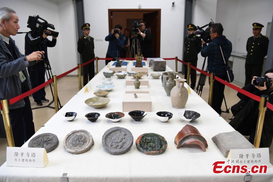 Restored porcelain works unearthed from the ancient Qinglong Township ruins are seen in Shanghai, east China, Dec. 8, 2016. Shanghai Museum on Thursday introduced the latest discovery since the excavation of the ruins in 2010. The Qinglong Township ruins is located in today's Baihe Township of Qingpu District in Shanghai, and documents recorded it as an important trade port in Tang (618-907) and Song (960-1279) Dynasties. In recent years, more than 6,000 restorable porcelain works and tens of thousands of broken porcelain pieces from nearby provinces were found in the ruins, which offers new evidence that Qinglong Township was an important port along the Maritime Silk Road. Besides, the discovery of the Longping temple, pagoda and its terrestrial palace in 2015 and 2016 helped the researchers to study the layout of the township as well as the history of China's ancient buildings and Buddhism. (Xinhua/Ren Long)