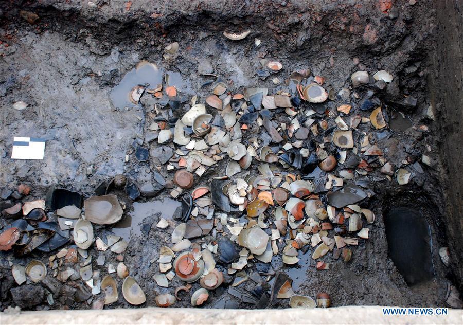 Porcelain pieces unearthed from the ancient Qinglong Township ruins are seen in Shanghai, east China, Jan. 14, 2011. Shanghai Museum on Thursday introduced the latest discovery since the excavation of the ruins in 2010. The Qinglong Township ruins is located in today's Baihe Township of Qingpu District in Shanghai, and documents recorded it as an important trade port in Tang (618-907) and Song (960-1279) Dynasties. In recent years, more than 6,000 restorable porcelain works and tens of thousands of broken porcelain pieces from nearby provinces were found in the ruins, which offers new evidence that Qinglong Township was an important port along the Maritime Silk Road. Besides, the discovery of the Longping temple, pagoda and its terrestrial palace in 2015 and 2016 helped the researchers to study the layout of the township as well as the history of China's ancient buildings and Buddhism. (Xinhua/Ren Long)