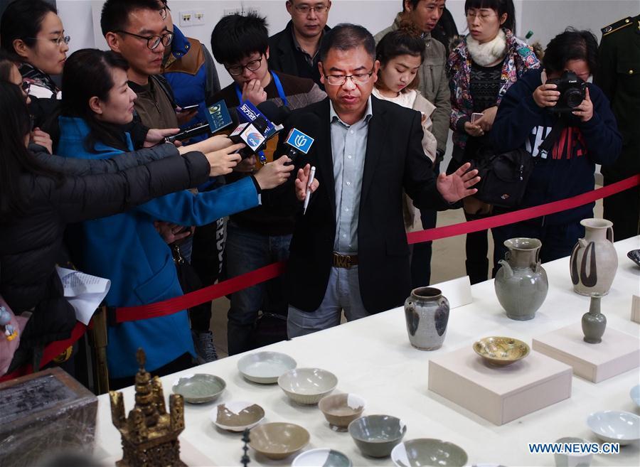 Chen Jie, leader of the archaeology team for the ancient Qinglong Township ruins, introduces their findings in Shanghai, east China, Dec. 8, 2016. Shanghai Museum on Thursday introduced the latest discovery since the excavation of the ruins in 2010. The Qinglong Township ruins is located in today's Baihe Township of Qingpu District in Shanghai, and documents recorded it as an important trade port in Tang (618-907) and Song (960-1279) Dynasties. In recent years, more than 6,000 restorable porcelain works and tens of thousands of broken porcelain pieces from nearby provinces were found in the ruins, which offers new evidence that Qinglong Township was an important port along the Maritime Silk Road. Besides, the discovery of the Longping temple, pagoda and its terrestrial palace in 2015 and 2016 helped the researchers to study the layout of the township as well as the history of China's ancient buildings and Buddhism. (Xinhua/Ren Long)