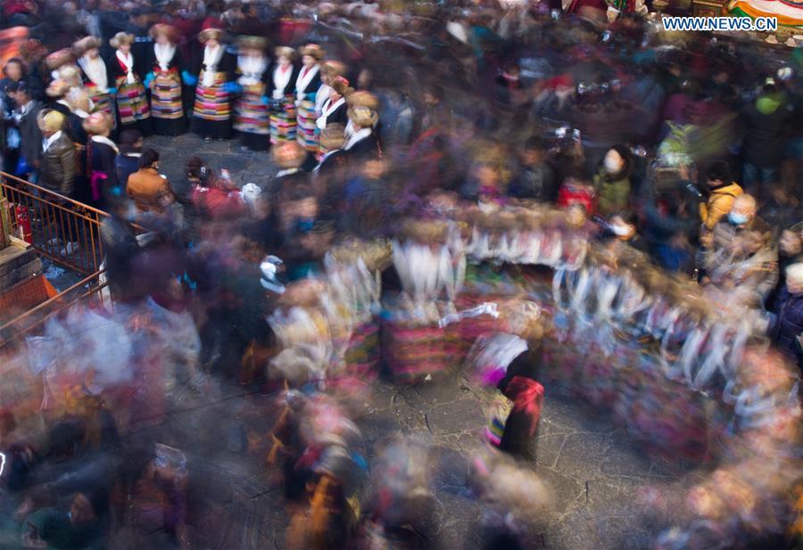 People celebrate the Fairy's Day at the Jokhang Temple in Lhasa, capital of southwest China's Tibet Autonomous Region, Dec. 13, 2016. The Fairy's Day falls on the 15th day of the 10th month of the Tibetan calendar. On that day, Tibetans celebrate the day to commemorate Buddha Aleanterre Brahm. (Photo/Xinhua)
