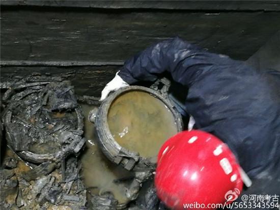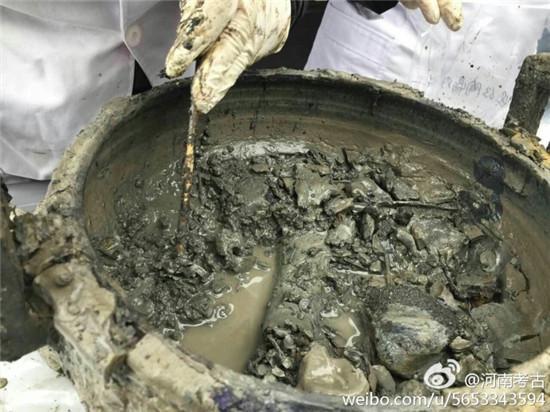 Several bone-filled cauldrons were recently unearthed during the excavation of an ancient tomb in Henan province. Experts have made a preliminary evaluation that the bones visible in the cauldrons came from the front limb of a cow. The two artifacts are a complete set, with the "jian" outside and the "fou" inside. In ancient Chinese culture, the jian was used to hold water while the fou was used for wine.