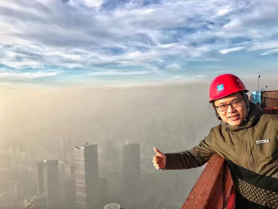 A reporter poses for a photo on the rooftop of Z15 Tower (C), also known as the China Zun, which is the tallest building in Beijing, on Friday, Dec. 16, 2016. The Beijing municipal government has mobilized public transportation and suspended schools for the city's first red alert for air pollution of the year, effective from Friday evening. Density of pollutants in Beijing is expected to increase from Saturday to Monday, followed by a weak cold front on Tuesday that will not disperse the smog, which will persist until Wednesday. [Photo: Beijing Times]