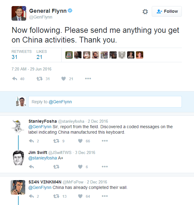 Fortunately, most Americans do not share the incoming administration’s fondness for fake news and conspiracy theories about China. In June 2016, Flynn tweeted that he was “now following” China, and asked users to “please send me anything you get on China activities.” The humorous responses show the deep interconnectedness between China and the U.S. Below are some of them: