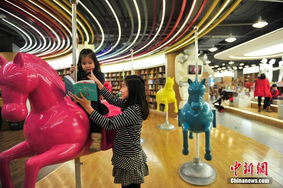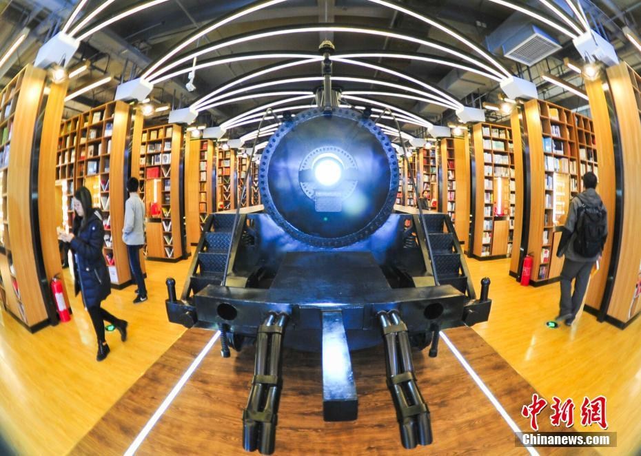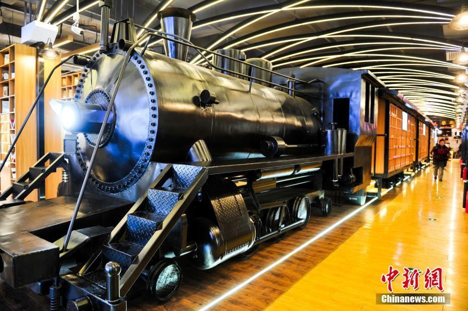 An old-fashioned steam locomotive is on display in the hall of a bookstore in Shenyang, Liaoning province. The cars of the train are connected by rows of bookshelves. Citizens are enjoying the chance to read books around the train.