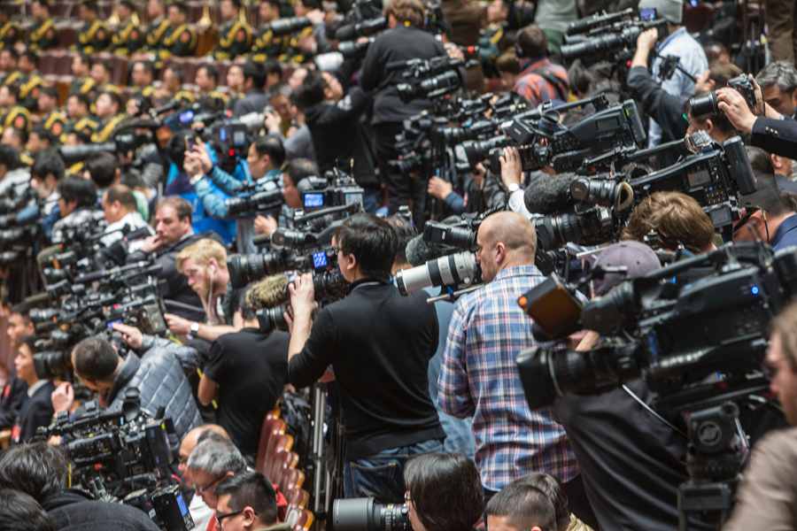 Camera crews at the opening meeting of the fifth session of the 12th National People's Congress (NPC) on March 5, 2017 in Beijing. (Photo by Shi Jiamin from People’s Daily)