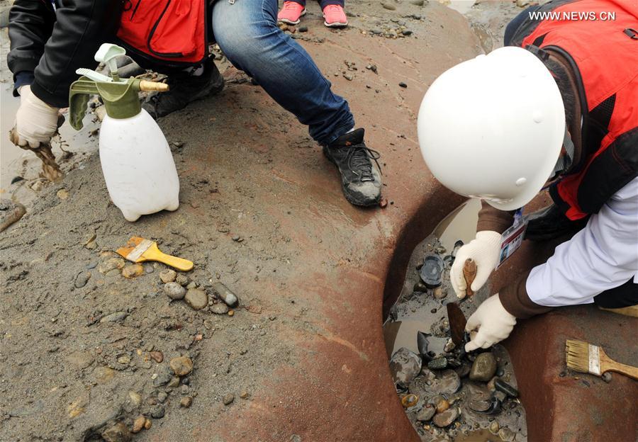 Photo taken on March 17, 2017 shows staff members working at the site of an archaeological excavation in Pengshan District under Meishan City, southwest China's Sichuan Province. More than 10,000 gold and silver items that sank to the bottom of a river in Sichuan Province over 300 years ago have been recovered, archeologists said Monday. The items included a large amount of gold, silver and bronze coins and jewelry as well as iron weapons such as swords, knifes and spears. (Xinhua/Chen Xie)