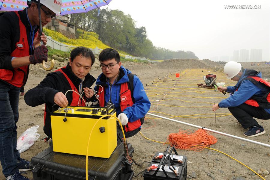 Zhou Jun (2nd L), a student from the University of Electronic Science and Technology of China, helps unearthed cultural relics at Pengshan District in Meishan City, March 17, 2017. More than 10,000 gold and silver items that sank to the bottom of a river in Sichuan Province over 300 years ago have been recovered, archeologists said Monday. The items included a large amount of gold, silver and bronze coins and jewelry as well as iron weapons such as swords, knifes and spears. (Xinhua/Chen Xie)
