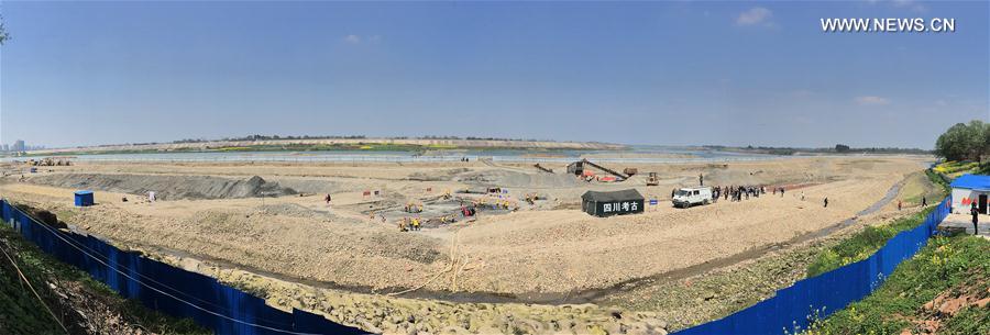 Photo taken on March 20, 2017 shows the overall view of the site of an archaeological excavation at Pengshan District in Meishan City, southwest China's Sichuan Province. More than 10,000 gold and silver items that sank to the bottom of a river in Sichuan Province over 300 years ago have been recovered, archeologists said Monday. The items included a large amount of gold, silver and bronze coins and jewelry as well as iron weapons such as swords, knifes and spears. (Xinhua/Li He)