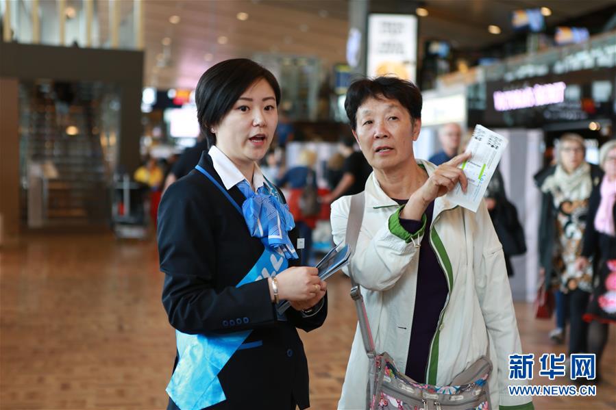 A Chinese-speaking guide working at the airport of Helsinki, capital city of Finland, offers service to a Chinese tourist. Beginning from the summer of 2016, the airport launched a series of services for Chinese tourists, including adding signs written in Chinese, setting up inquiry desk of Chinese guides, opening microblog account and launching Chinese apps. (Xinhua News Agency)