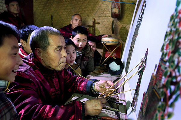 Students practice shadow puppetry under the guidance of their teacher at Zhongshan Experimental School in Luanxian, Hebei province.Mu Yu / Xinhua