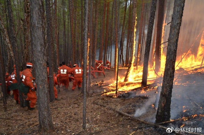 Firefighters battling a fire in the Greater Hinggan Mountains (Photo taken by Global Times)
