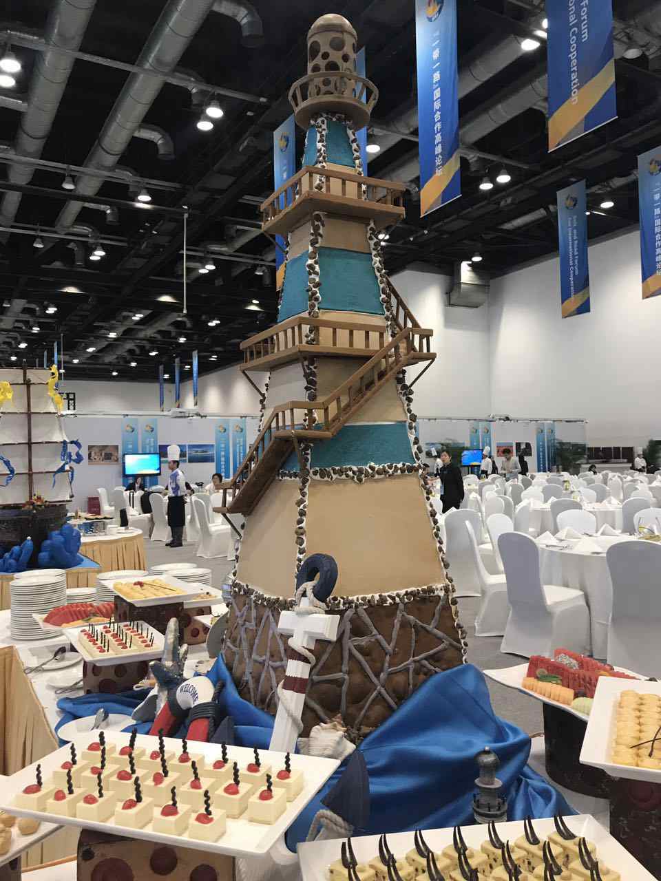Photo taken on May 12 shows a model light tower on display at the cafeteria in the media center for the upcoming Belt and Road Forum for International Cooperation. The media center offers free meals, fruits, coffee, tea, and desserts for journalists. (People’s Daily Online/Wang Yuran)