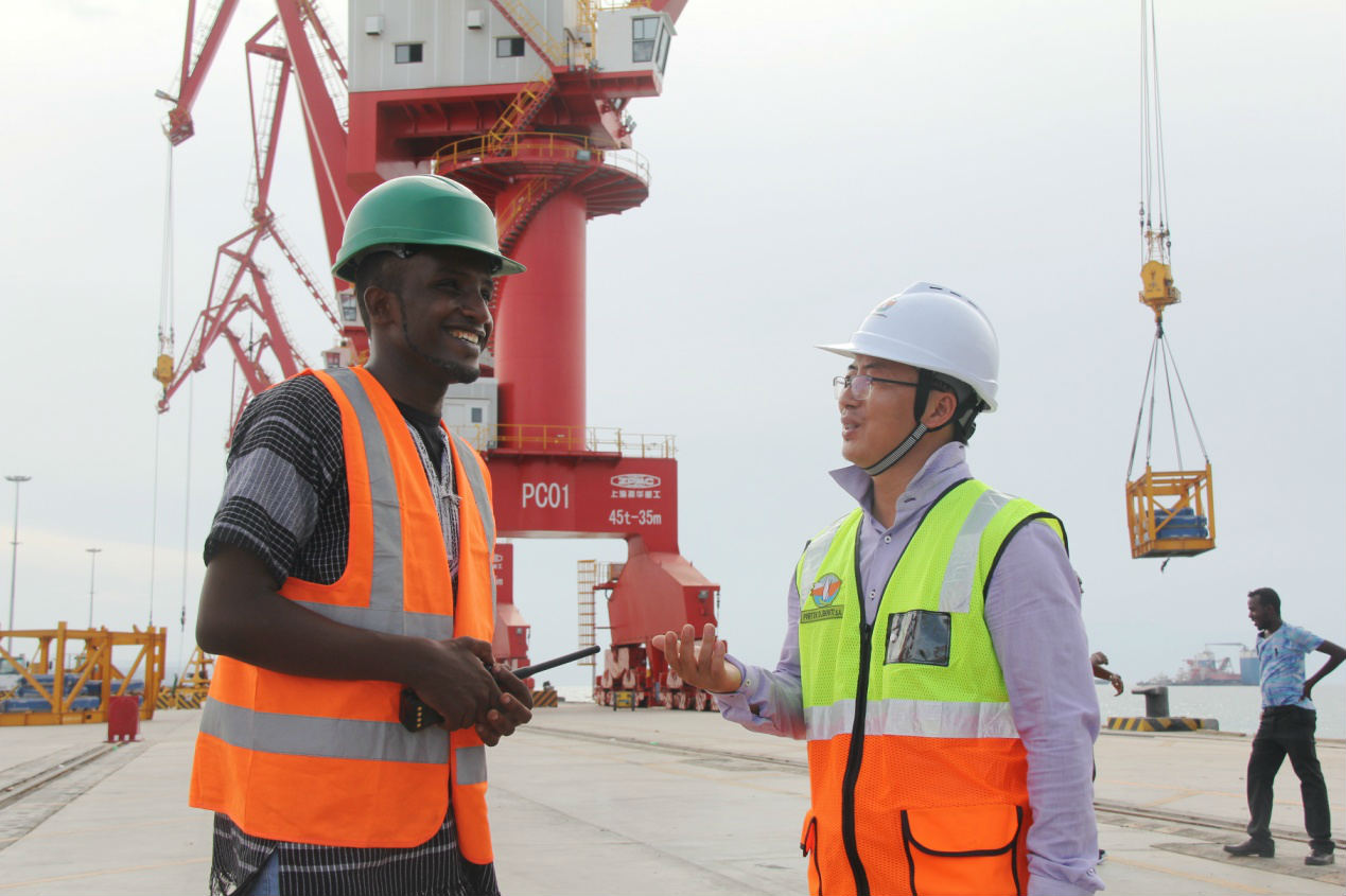 Chinese and Djiboutian administrative staffs exchange views on a new dock built by China Merchants Group Limited (CGM) in the port in western suburb ofDjibouti. The multi-functional Doraleh dock has greatly improved the competence of the port. (Photo by Li Zhiwei from People’s Daily)