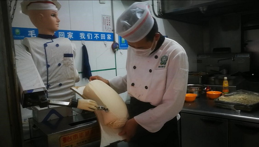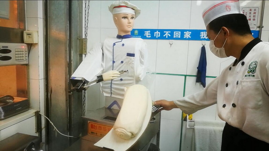 Noodle-making robots have become great helpers for many Chinese chefs. They hold sharp knives and move their arms back and forth, peeling noodles off a piece of dough into boiling water. Although not a new concept in China, the robots never cease to attract attention from diners. And why is that? Probably because, in addition to their noodle-making skills, they are dressed like chefs in white uniforms and boast human-like facial features.