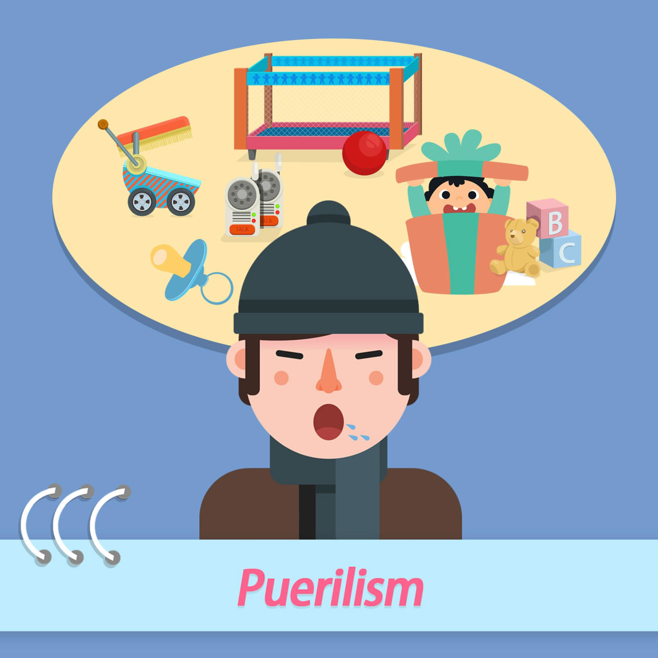 As a symptom of mental disorder, puerilism depicts immature or childlike behaviors by an adult without self-awareness.