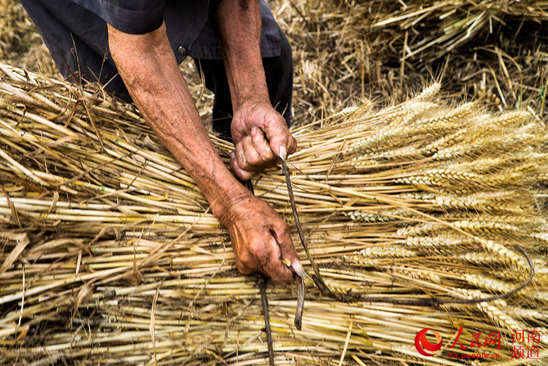 Gao reaping wheat in a field within Yeping Village in Lushan County, Henan province