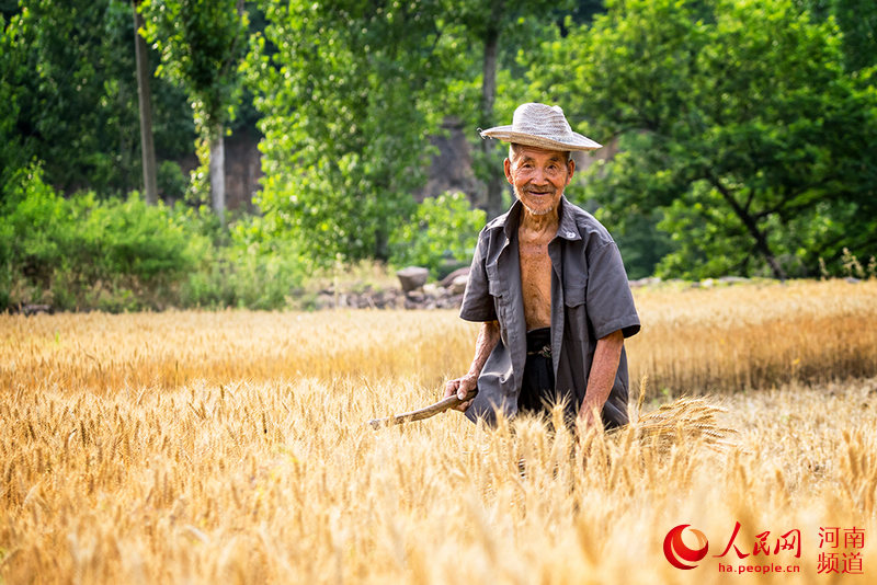 Gao reaping wheat in a field within Yeping Village in Lushan County, Henan province