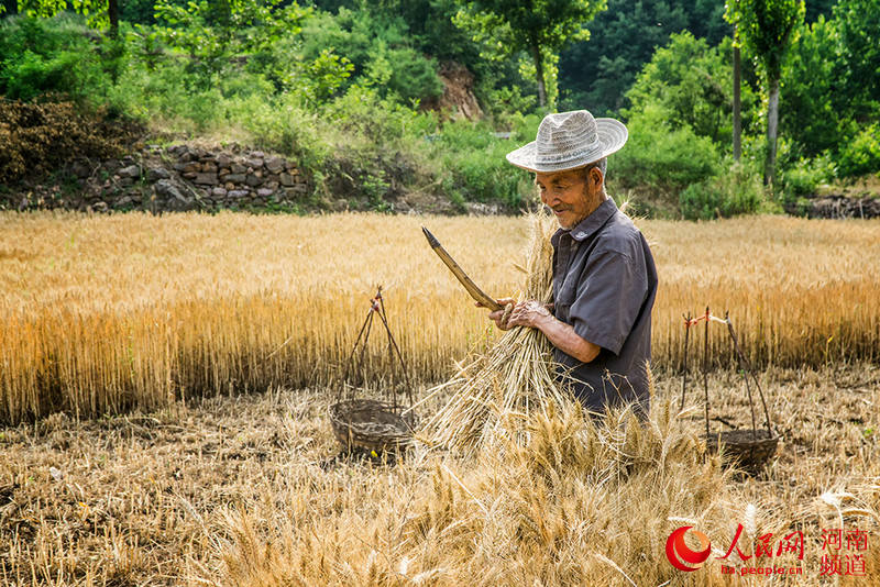 Gao reaping wheat in a field within Yeping Village in Lushan County, Henan province
