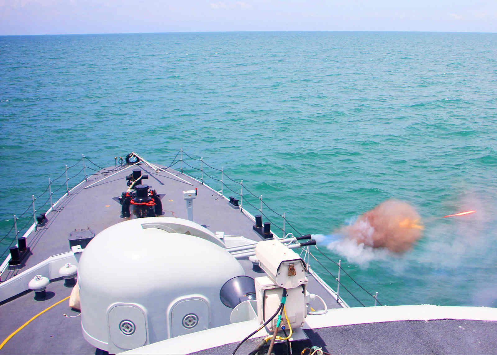 The missile boat Panyu (Hull 773) attached to a frigate flotilla with the South China Sea Fleet under the PLA Navy fires its main gun at simulated sea targets during a realistic training exercise in an undisclosed sea area of the South China Sea on June 9, 2017. (eng.chinamil.com.cn/Photo by Zhang Bin)
