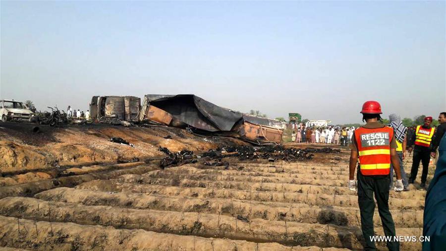 Photo taken with a mobile phone shows rescuers and people gathering at the accident site in east Pakistan's Baahawalpur, a district in Punjab, on June 25, 2017. At least 120 people were killed and over 100 others injured in an oil tanker fire Sunday morning, said hospital sources. (Xinhua)