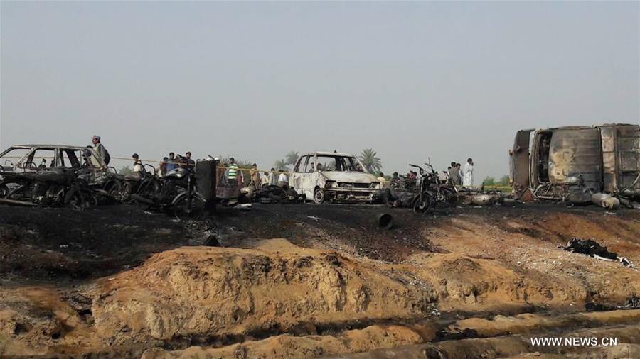 Photo taken with a mobile phone shows rescuers and people gathering near burnout vehicles at the accident site in east Pakistan's Baahawalpur, a district in Punjab, on June 25, 2017. At least 120 people were killed and over 100 others injured in an oil tanker fire Sunday morning, said hospital sources. (Xinhua)