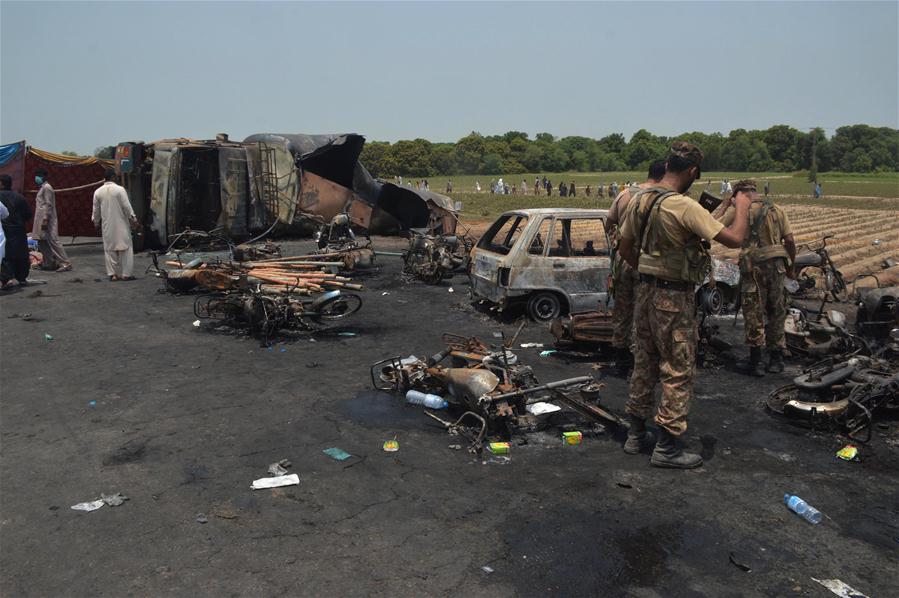 Pakistani soldiers examine the oil tanker accident site in eastern Pakistan's Bawahalpur, on June 25, 2017. At least 140 people were killed and over 120 others injured in an oil tanker fire that happened in the Pakistan's eastern Punjab province on Sunday morning, said a local parliamentarian.(Xinhua/Stringer)