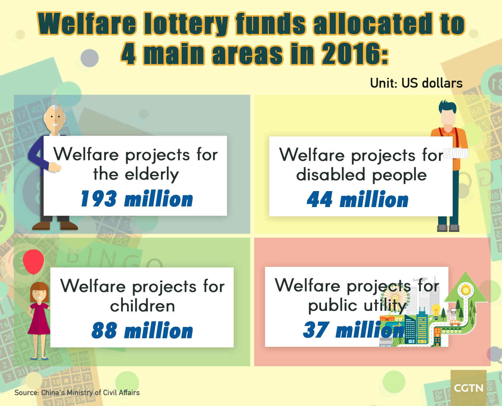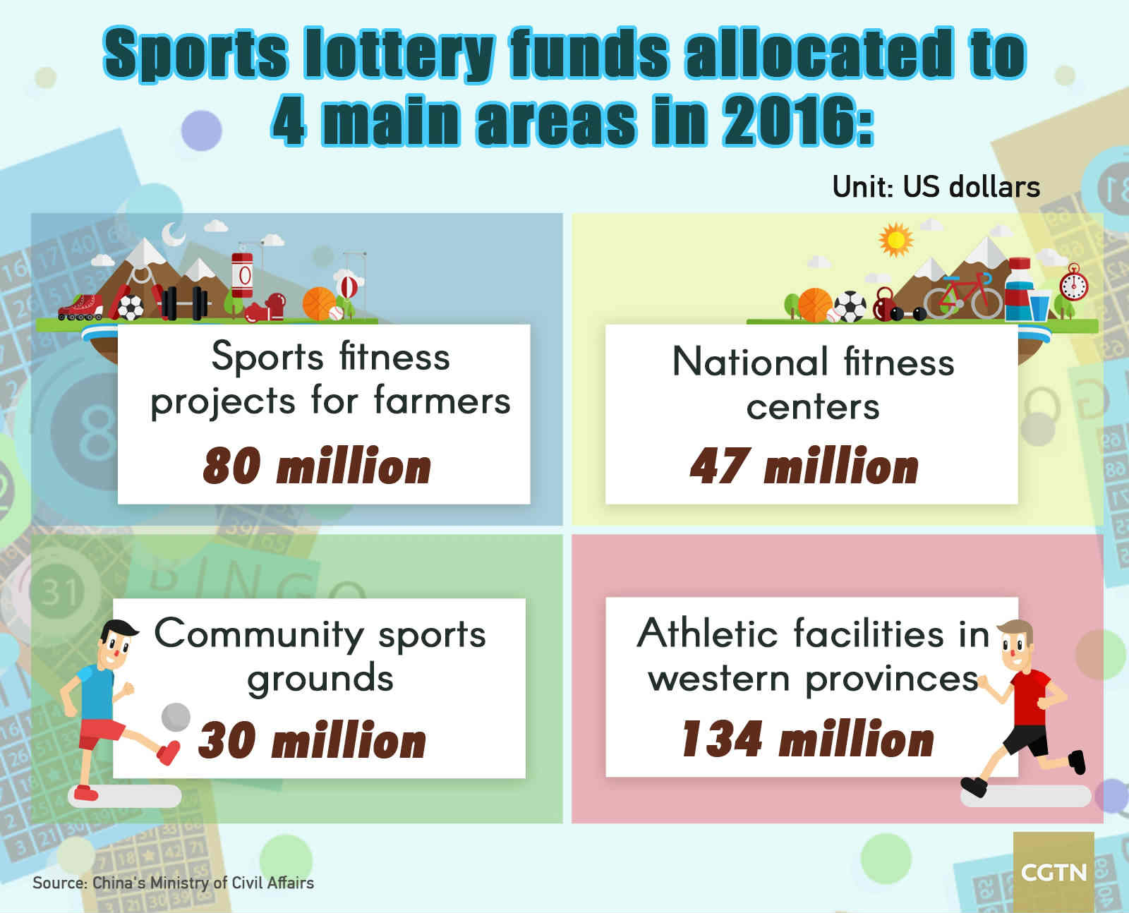 Funds from the Welfare Lottery are divided into different sub-sections. In 2016, the Ministry of Civil Affairs had Welfare Lottery funding in its sports branch amounting to 388 million US dollars, 3.5 percent lower than the year before, according to a statement the ministry released on Friday.