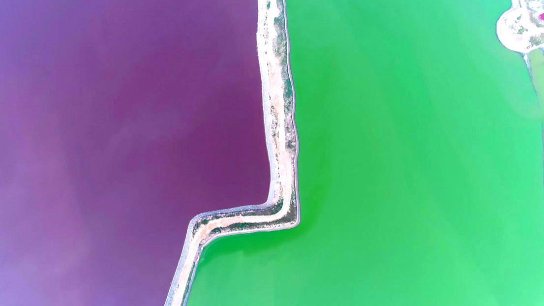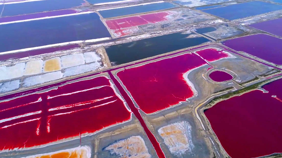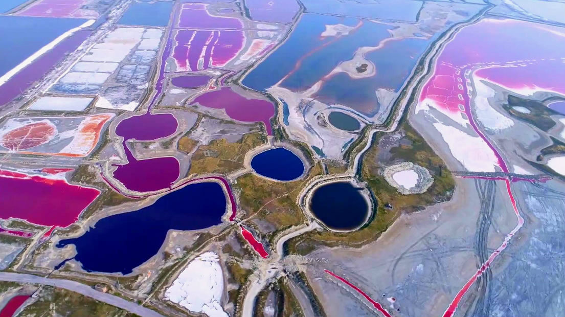 Experts say the rising temperatures have resulted in unusually fast growth of the algae and brine shrimps in the lake. Different types of algae at different densities reflect different lights, producing a beautiful multi-color image, which gives viewers a spectacular aerial view.