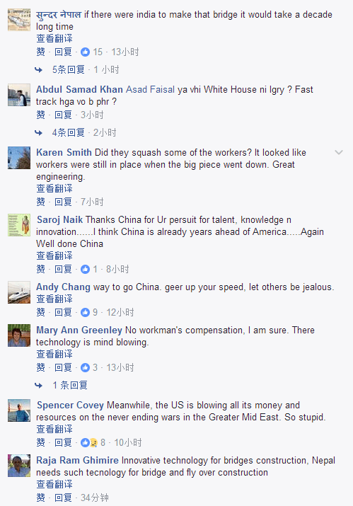 One video revealed the operation of bridge girder erection machine during the building of a high-speed railway in China. Viewed almost a quarter of million times, the video was shared by 2,500 people and received 9,000 likes. “Thanks China for [your] pursuit for talent, knowledge [and] innovation…I think China is already years ahead of America…Again, well done China!” a foreign netizen commented.