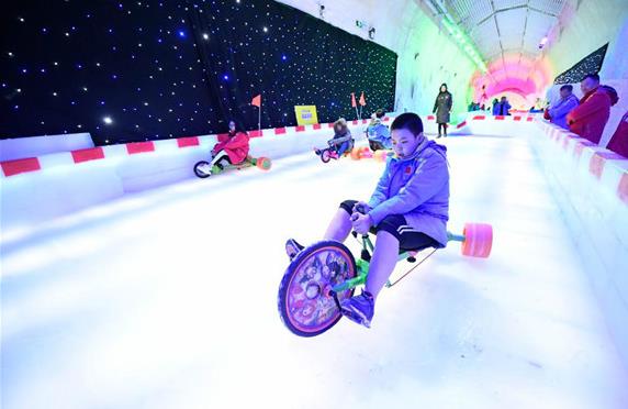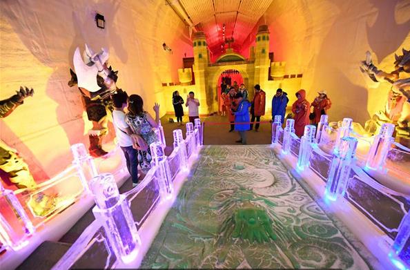 The man-made ice cave is a large-scale tourist project designed by a top international team and produced by well-known local and overseas ice sculpture masters at the cost of 27 million yuan.